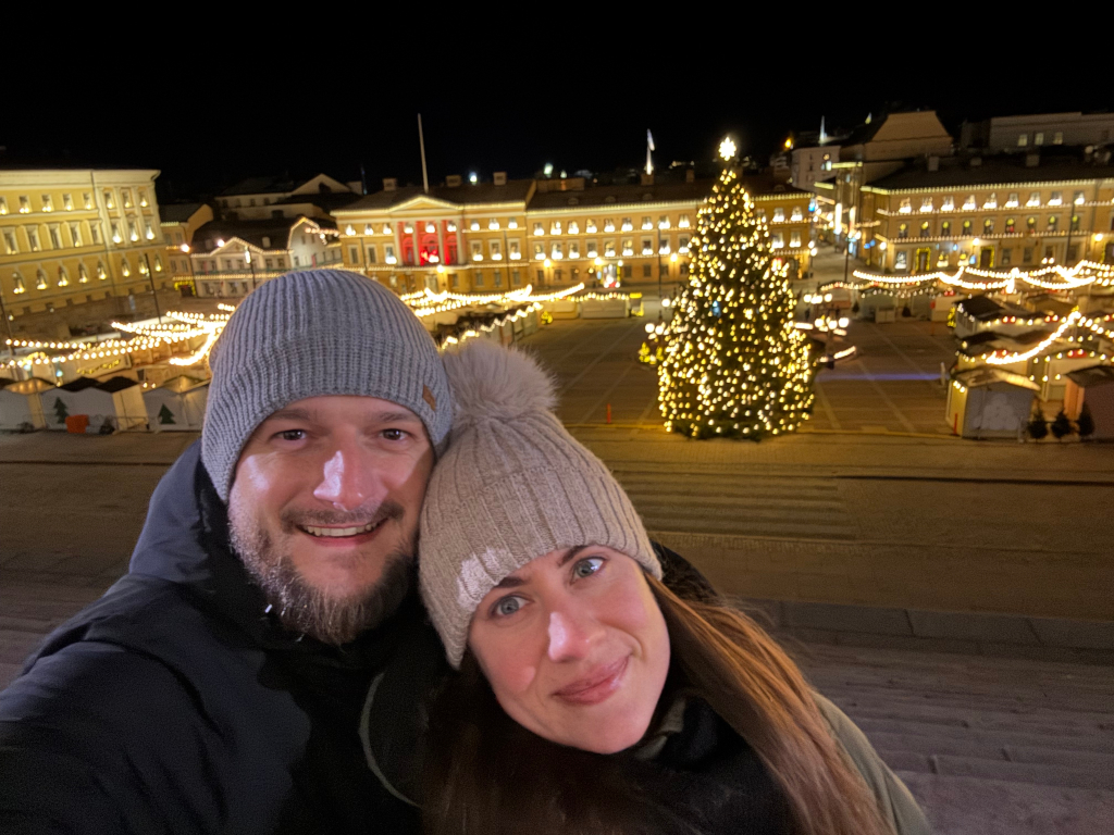 Do Helsinek dosedneme na letišti Vantaa okolo 22:30h, sedneme na vlak a necháme se odvézt do centra, kde jsme asi 15min od stanice ubytováni v tradiční finském bytě. Co nás ohromuje, je noční živost mládeže, před kluby se tvoří fronty polonahých slečen a mládežníků, kteří musí čekat v mrazu i hodinu, než se dostanou do klubů. My si odhodíme batohy na ubytku a jdeme se courat městem, mezi půlnocí a 2h ráno projdeme vánočně vyzdobeným městem až k senátní budově, kde máme úplně prázdné trhy jen pro sebe - je to nádherný pohled.