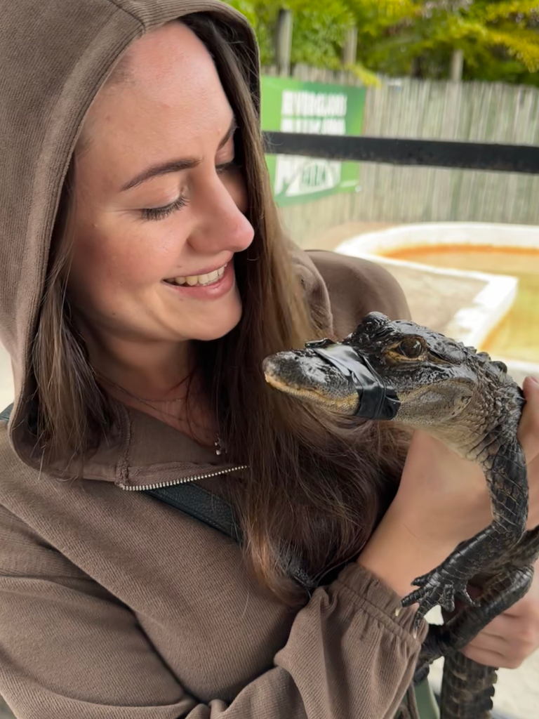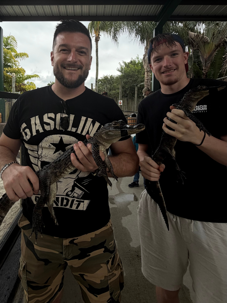 Projížďka byla opravdu super, dost jsme si jí užili a snad bychom šli klidně i znovu, je nám ale mokrým vcelku zima a jdeme se podívat ještě na aligátoří show. Tohle je dost krutý, ve výběhu má chlapík dvě aligátorky, jednu "Beauty" a druhou "Beast". Pro představení si samozřejmě vybere Beast, které je 40 let, měří tři metry a váží okolo 300kg. Žádné ochranné pomůcky, žádný asistent vedle, tahá jí za ocas, otevírá hubu, sedí na ní a u výkladu jí hladí zoubky, aby demonstroval, kdy Beast sklapne čelisti. Prdelí bych při tom mohl štípat ocelové dráty, fakt se mi tají dech. Když skončí, vyndá nám do ruky malé tříleté aligátory, už tyhle malé potvory mají zuby jak břitvy, nás tohle ale hodně baví, je to skvělý zážitek.